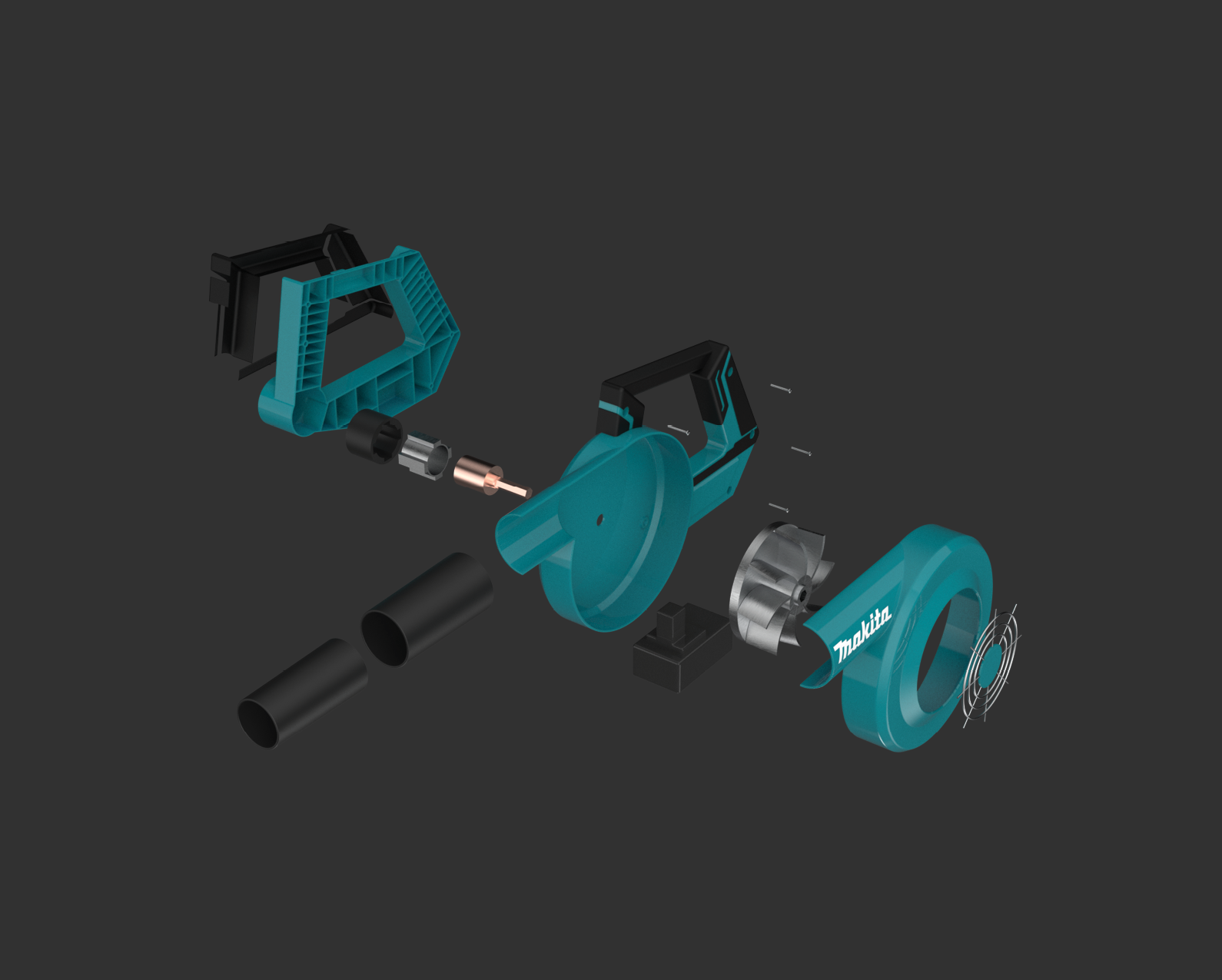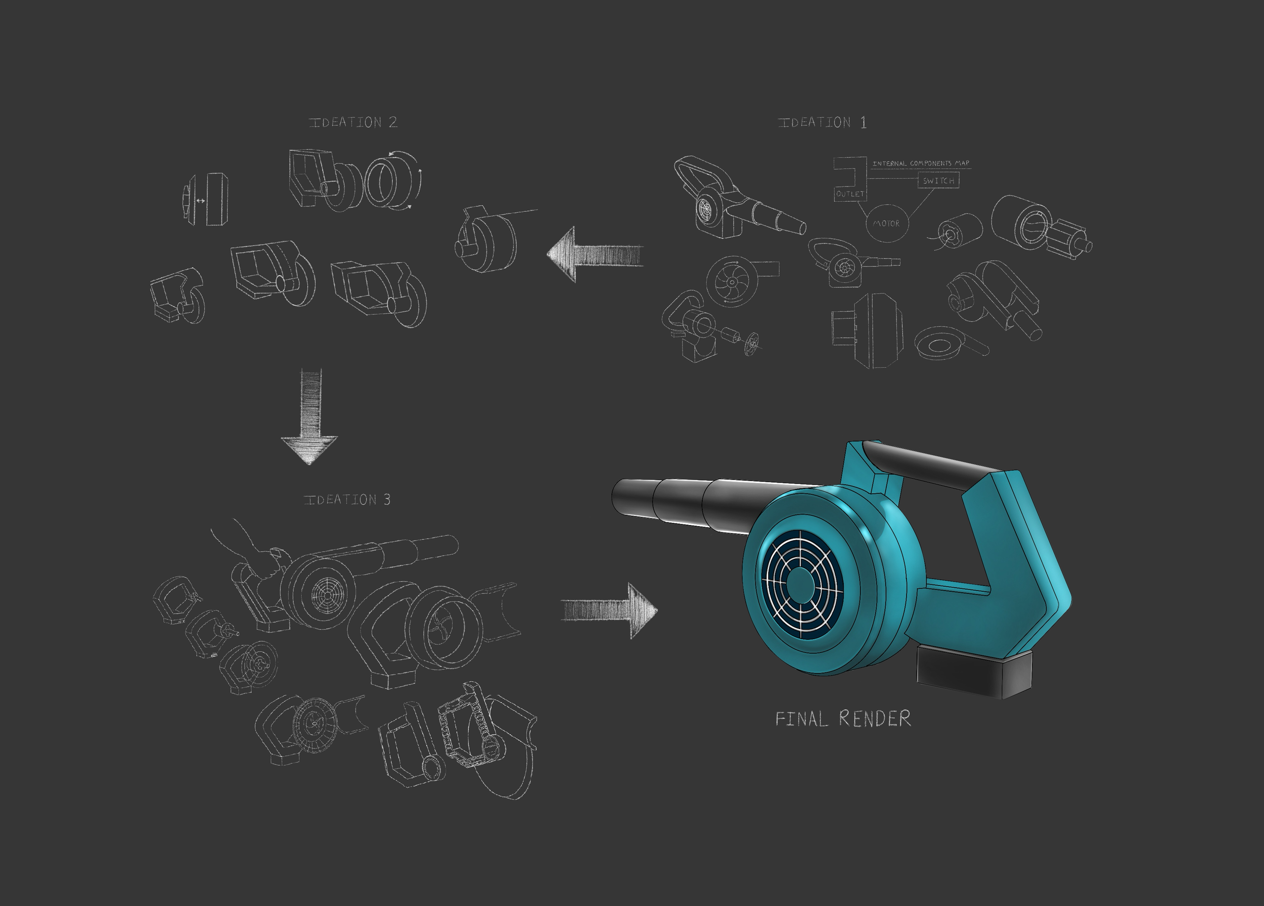 The goal of this project was to design a compact and easy-to-use Makita-branded Leaf blower. This project involved drawing sketches, Ideating, and finalizing the general aesthetic. The project used a combination tools such as drawing, Vizcom AI, SolidWorks, and keyshot with an equal focus on the design of internal components and ribbing.